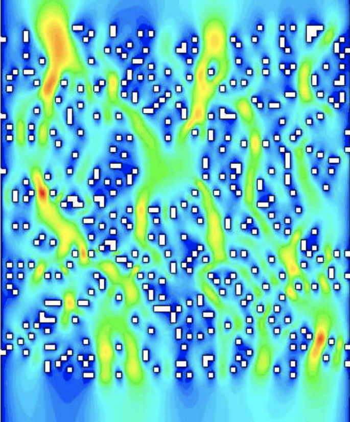 In the figure above from Stanley et al. (2003), the white pixels are obstacles to the flow of water (much like coffee particles) and redder colors correspond to regions where water flows more rapidly. I rotated the figure to make it more similar to coffee percolation where water flows downward. The simulation above would correspond to a V60 that drips at an extremely slow rate of 5 mg/s.