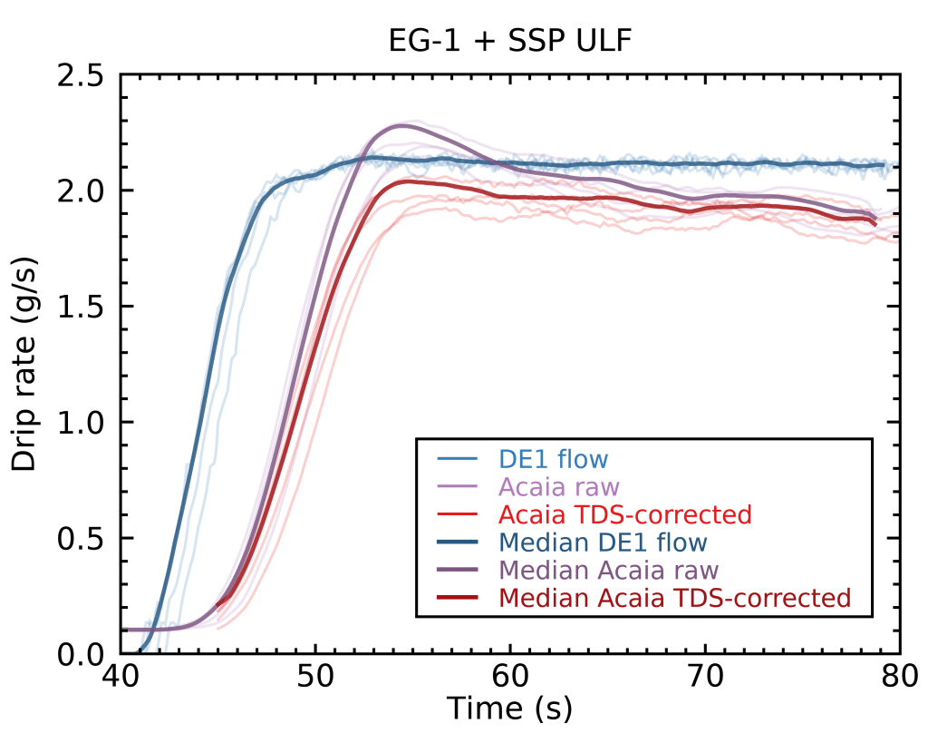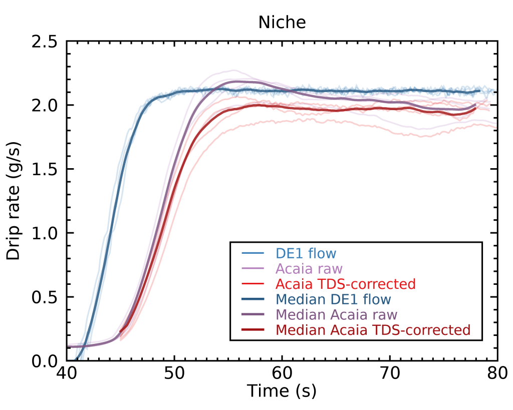 The fact that the Acaia scale-based flow rates in my previous experiment tapered off near the end of the shots was likely related to the TDS of the shots decreasing, in a way consistent with the TDS curves I had predicted.
