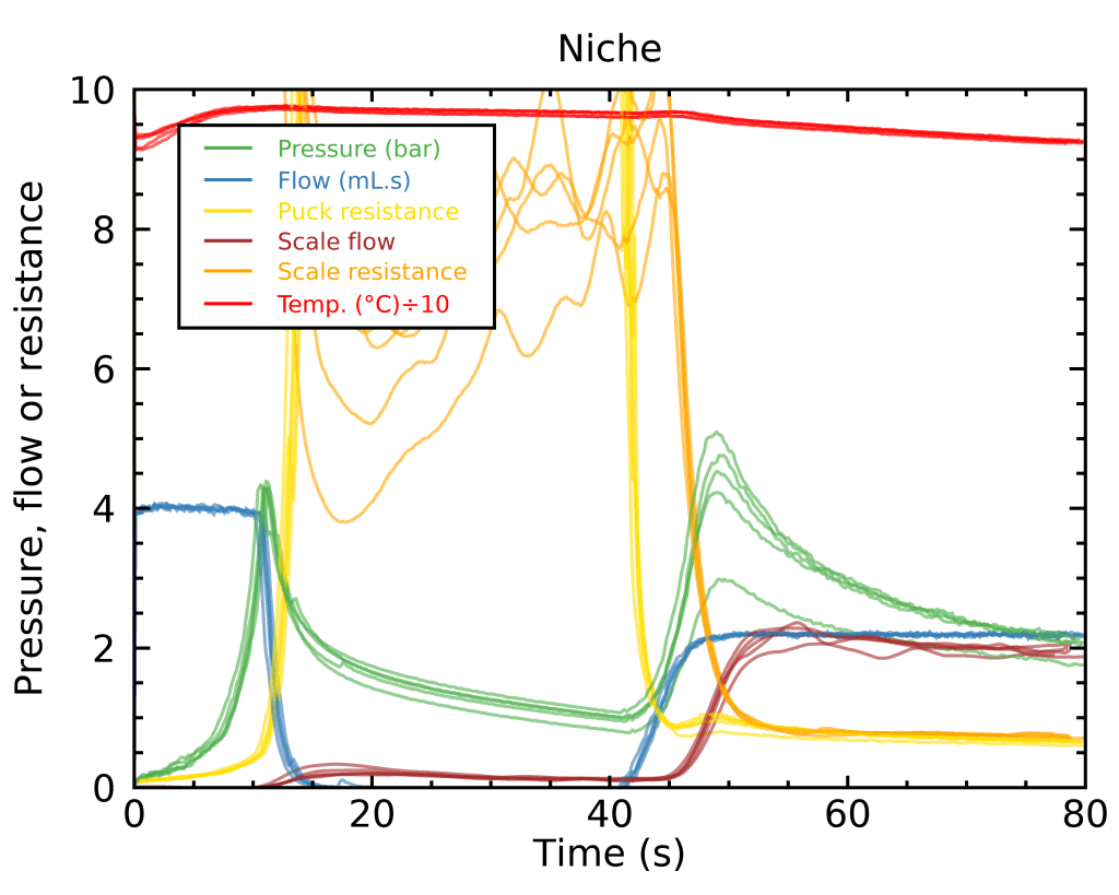 Now, there is still a non-negligible constant shift between the gravimetric and volumetric flow rates, and that could be due to specificities of my own DE1’s tubings or my local electrical grid. Thankfully, I can easily calculate this shift and correct for it, by looking at the median ratio of flow in the last 10 seconds of each shot. Quite interestingly, this factor was slightly different for the Niche and the EG-1; The DE-1 over-predicted the Niche flow rates by 8 ± 2%, and the EG-1 flow rates by 12 ± 1%. This difference between the two grinders is on the edge of being statistically significant, and could be explained either by a systematic error in the exact TDS values I predicted from my puck resistance – EG-1 flow rates would be affected more by an error because of its higher TDS on average – or to a different amount of oils and undissolved solids between the EG-1 and the Niche.